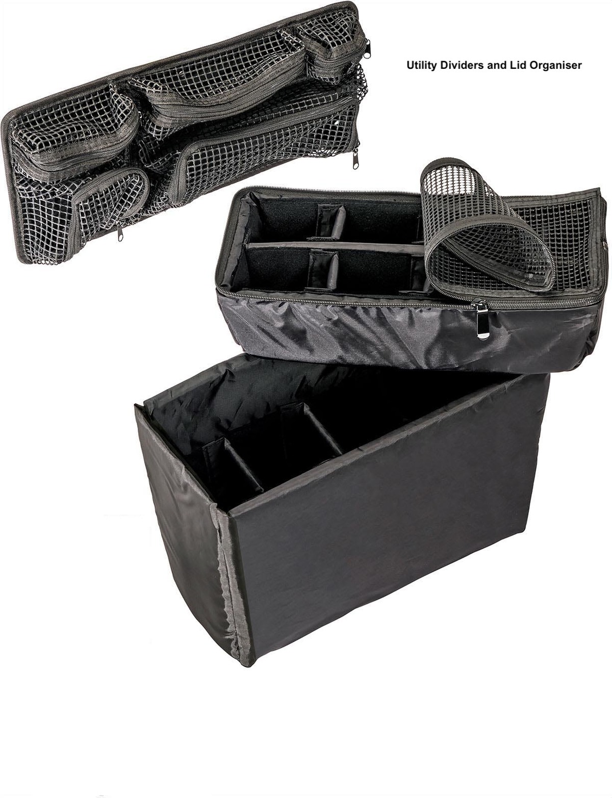 - Secondly is the 'Utility Padded Dividers with Lid Organiser', these are Padded Dividers in two Layers (one for Camera Equipment sized items and a second zippable layer for small items). Also a lid organiser with mesh pockets for smaller items. Also includes a shoulder strap.