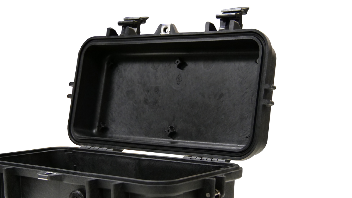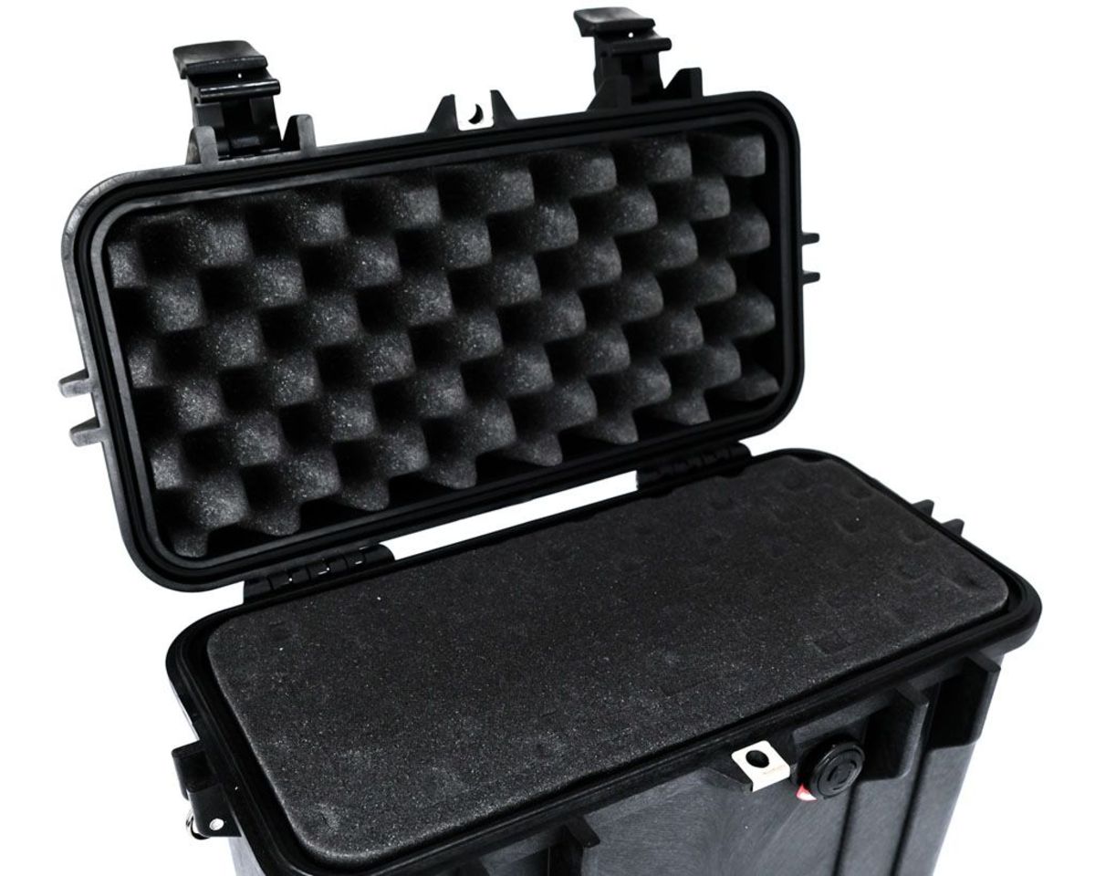 • Pick and Pluck Foam, this is a high-density foam that comes in 5 Layers. First is a convoluted lid foam, then 3 large Pick-N-Pluck™ foam layers filling the rest of the case (with a thin extra layer of foam in the base). The Peli Pick N Pluck™ foam is easily cut with a knife or just pulled out manually as it's pre-scored into small cubes.